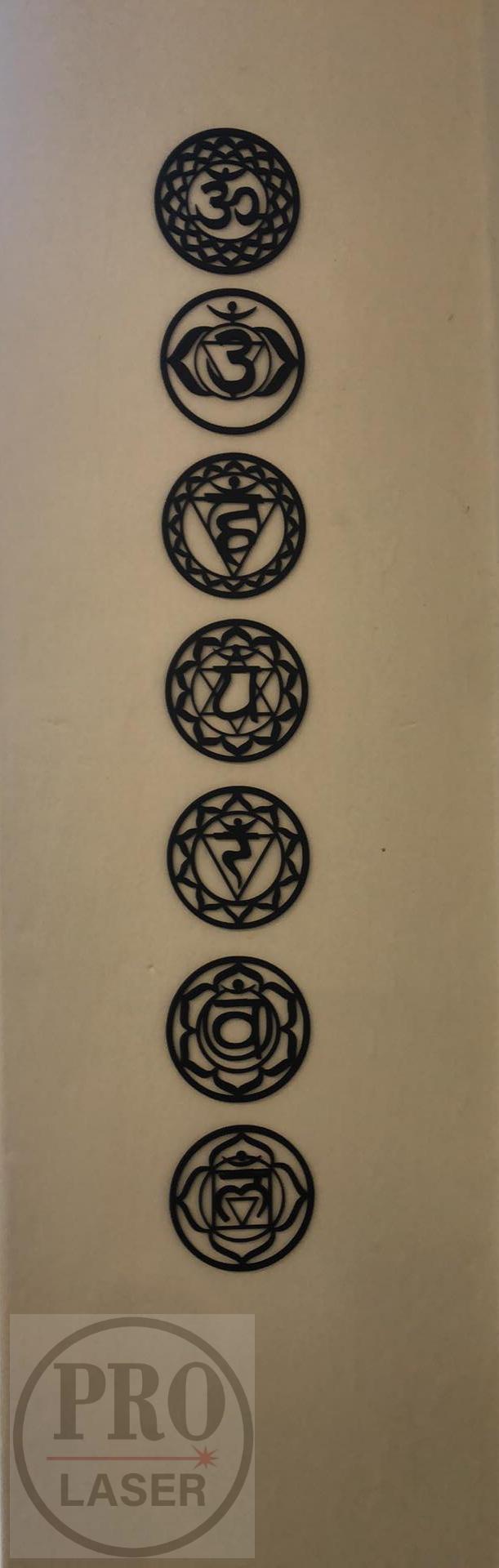 Dřevěné symboly čaker, kompletní sada 7ks. Možno zvolit různé barvy a průměry až do 50cm. Materiál překližka Topol 4mm, nebo HDF 3mm. celý popis