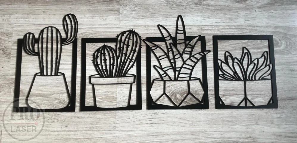 Čtyřdílná sestava dřevěných obrazů kaktusů.