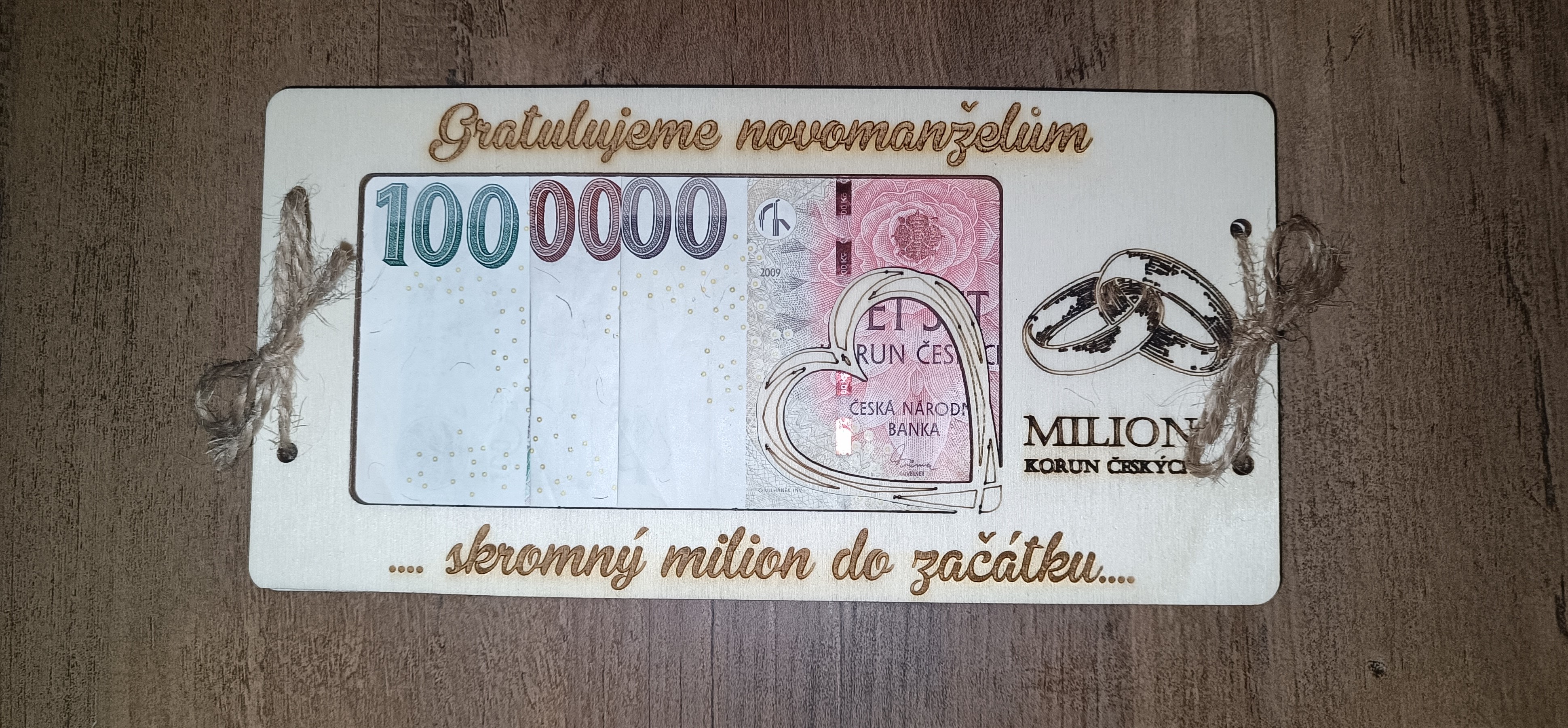 Mezi dvě destičky se vloží bankovky dle obrázku a svážou se přiloženým jutovým provázkem.